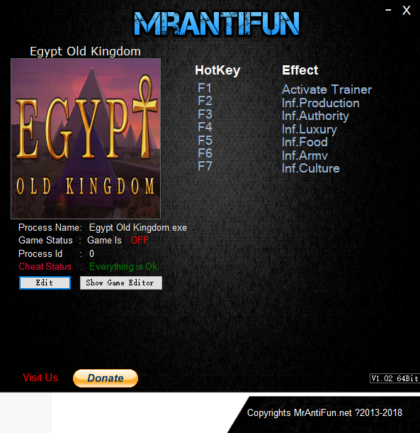 《埃及古国》六项修改器由MrAntiFun制作,拥有无限产能,无限文化等强大功能,使用之后能够轻松度过游戏难关,需要的玩家不妨下载体验一下。