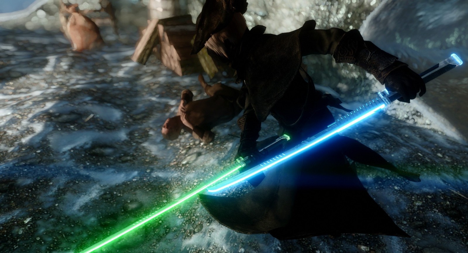 《上古卷轴5:天际》此mod是好看的光束武士刀MOD,MOD包括光束武士刀10把,共5种颜色,单手及双手,与原版乌木剑属性相同,但是挥动速度要快10%,可强化,可附魔。游戏中可输入help seiryuu 获取代码。