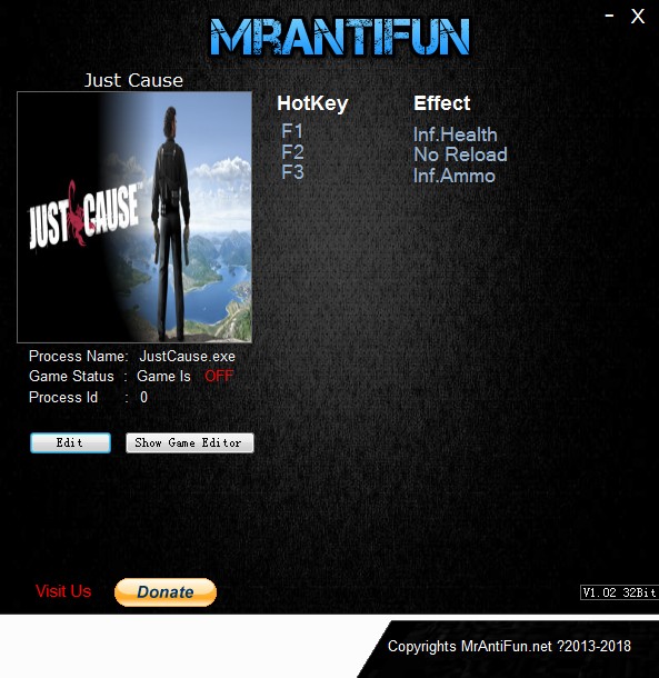 《正当防卫》(Just Cause)初代v07.31.18三项修改器[MrAntiFun],带给你强大的修改效果,包含无限生命弹药等强大修改功能,建议适度使用,以免降低您的游戏体验。