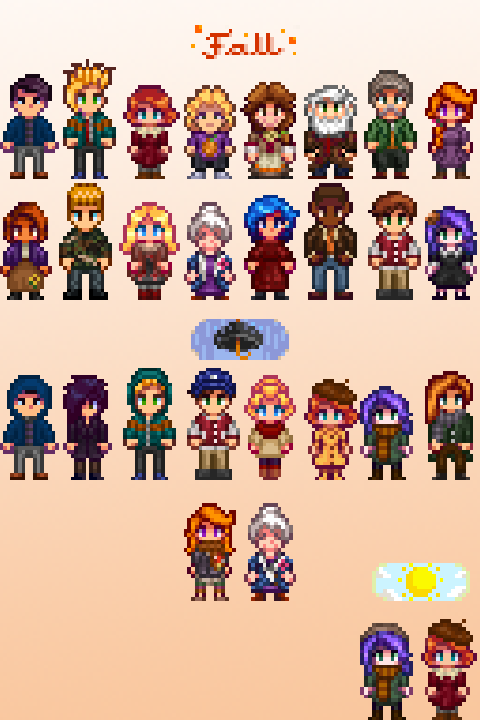 《星露谷物语》季节性服装MOD,村民吗们的服装会根据季节的变换来进行变化,相当不错的功能mod,服装将自然切换出来,欢迎前来下载。