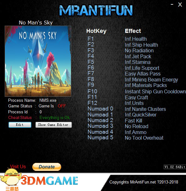 《无人深空》v1.55十八项修改器MrAntiFun版下载,超多强的功能,让你的星际之旅更加的轻松和舒适,包含无限生命,无限能量的等多种效果,建议适度使用,以免影响到您的游戏体验。