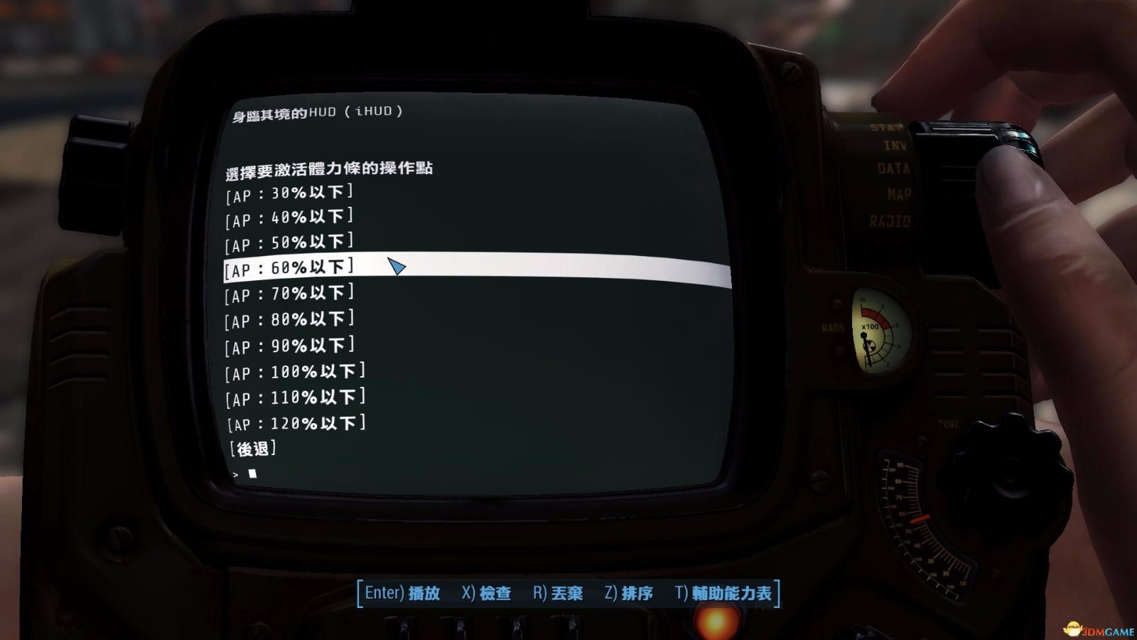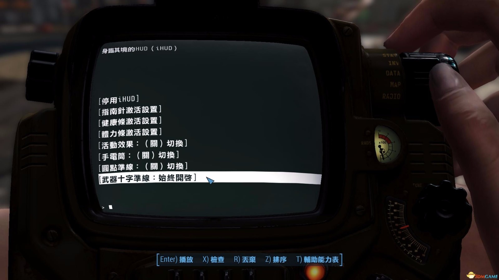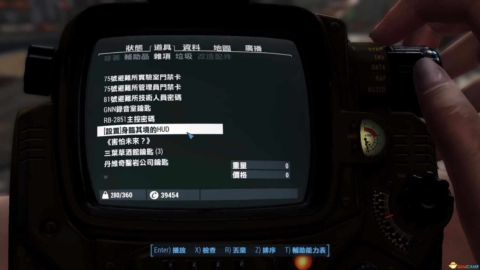2、MOD安装好后,管理器勾选上esp文件,进入游戏会自动入包一个卡带。打开哔哔小子,在道具、杂项里找到“身临其境的HUD卡带”点击进行设置;