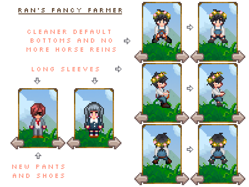 《星露谷物语》花式农夫mod,给你的服装增加了一些部件,让你有更多的选择空间,并且有了骑马专用的裤子,代替了马缰绳,做得相当精致,感兴趣的话,就来下载吧!