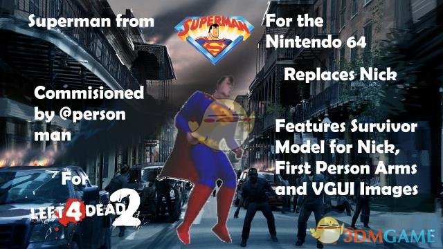 《求生之路2》超人替换尼克MOD。一款简单的角色替换补丁,这个补丁的作者将游戏中原版的尼克替换成了很经典的超人造型,超人的模型是比较老的风格,喜欢的玩家不要错过。