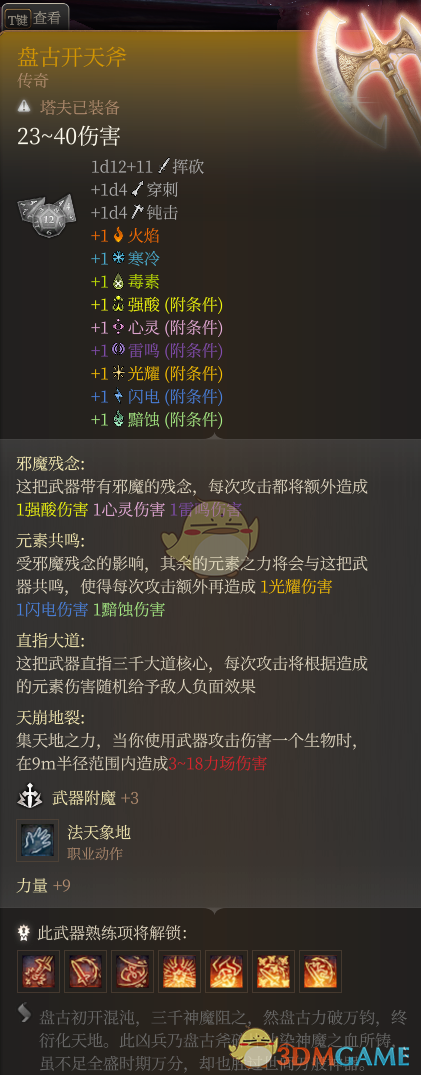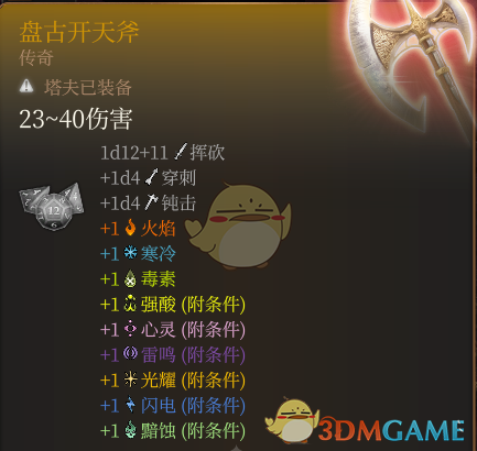 《博德之门3》盘古开天斧MOD。正如其名。下载安装这款模组玩家可以一把传奇武器-盘古开天斧,一把全元素伤害传奇巨斧,强度不算太离谱,保证了可玩性!具体效果见下图!是款非常不错的MOD。感兴趣的玩家快来3DM下载吧!