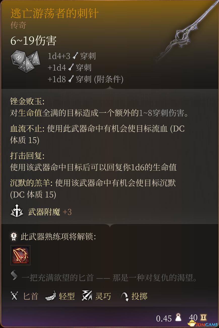 《博德之门3》逃亡游荡者的刺针增强MOD。正如其名。这款模组将传奇武器逃亡游荡者的刺针就行了增强,赋予了强大的属性和被动(附魔+3 沉默目标+回自己血+目标流血),具体效果见下图!是款非常不错的MOD。感兴趣的玩家快来3DM下载吧!