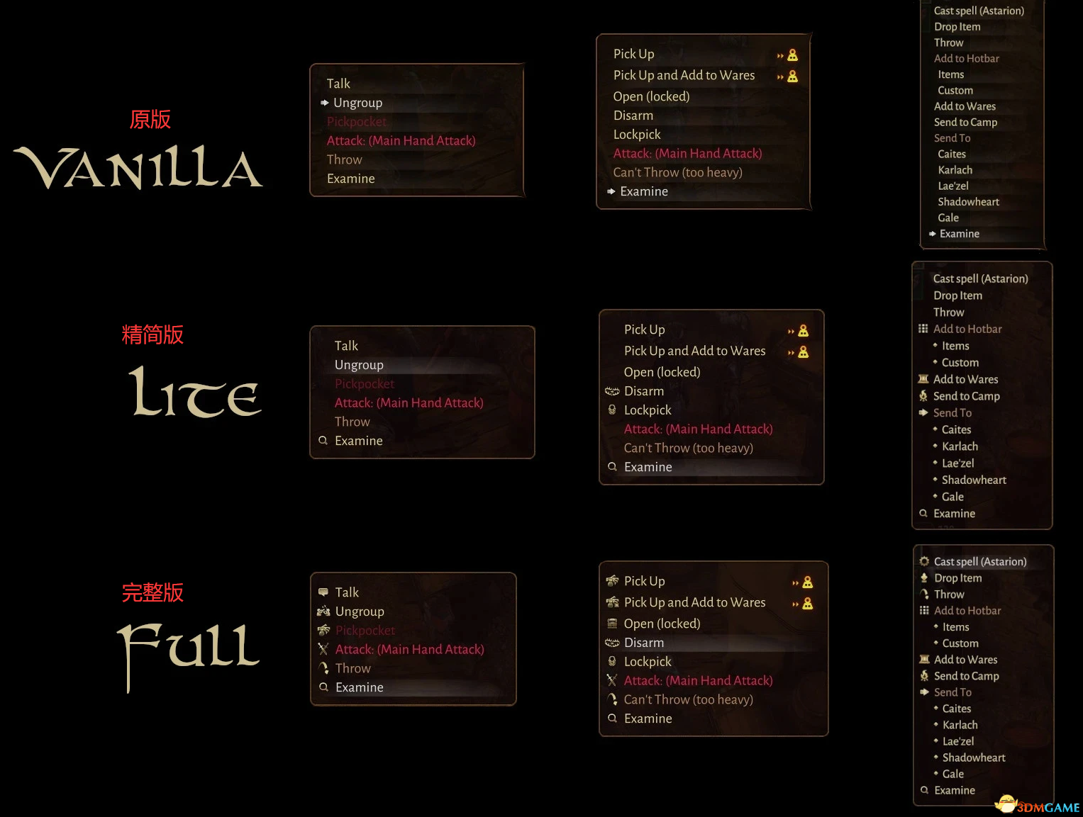 《博德之门3》更好的下拉菜单MOD。优化界面UI类型的mod,原版游戏的右键菜单只有文字,作者添加了图标让辨识度更高,同时优化了窗口动画的渲染速度,有完整版和精简版2种选择!具体效果见下图!是款非常不错的MOD。感兴趣的玩家快来3DM下载吧!
