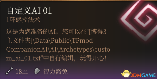《博德之门3》为同伴角色提供AI控制MOD。这个Mod提供了10种AI选择,适用于任何职业或同伴角色。此外,还包括3个可自定义的空白AI,供你自行编辑。该mod只在战斗中生效,不会影响游戏进程。启用/禁用AI的法术无需消耗任何资源,可随时更改角色的AI角色或在战斗中禁用它。这也适用于动物/召唤物和友好NPC(在战斗结束后别忘了禁用它)!是款非常实用的MOD,感兴趣的玩家快来3DM下载吧!