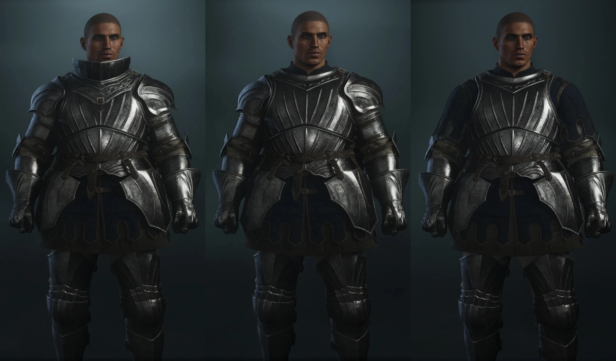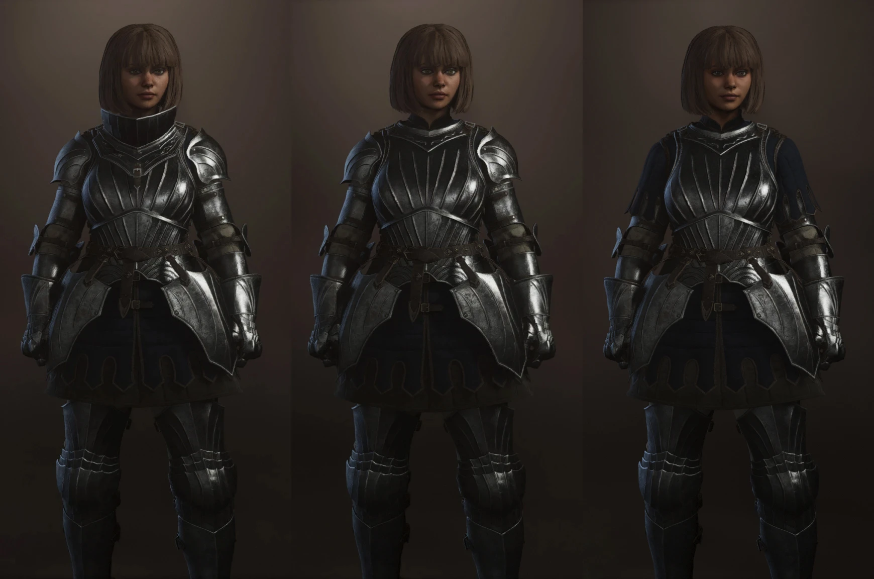 1、一款适用于男性和女性角色的三种“行军者盔甲”款式。