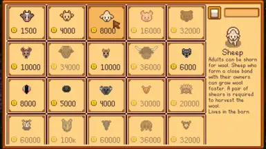 1、面向玩家的功能是自定义动物商店菜单,它取代了Marnie的动物购买菜单。