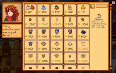 《星露谷物语》畜牧集市MOD,这个mod修改了购买农场动物的菜单,并为玩家提供了创建自己的自定义动物商店的方法。