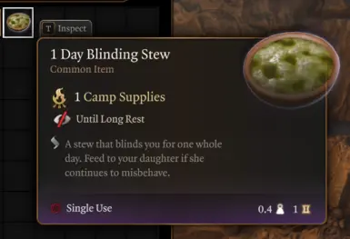 《博德之门3》致盲炖菜MOD,这个mod实际上所做的只是用定制的炖菜代替Okta给你的稀粥,这种炖菜会对食用它的人造成盲目状态,直到长时间休息。
