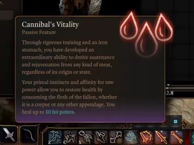 《博德之门3》食人族的活力MOD,曾经想尝尝禁忌的肉吗?现在你可以了!这会将一个名为 Cannibal's Vitality 的壮举添加到壮举选择列表中。通过选择这项壮举,您将获得一种名为“吞噬尸体”的能力,它可以让您在尸体上使用它来治疗自己 1d8 + 您的体质修改器作为奖励动作。您也可以以相同的量消耗身体部位的愈合。