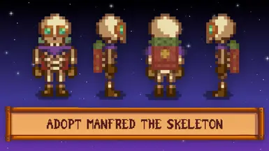 《星露谷物语》领养骷髅曼弗雷德MOD,Manfred 是一只独立的宠物,不会取代任何现有的宠物。一旦你拿到宠物许可证,你就可以从Marnie那里收养他(在与你的第一只宠物建立完全的友谊并为Manfred买了自己的水碗之后。别忘了喂你的骨架,我在看着你)。