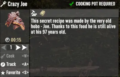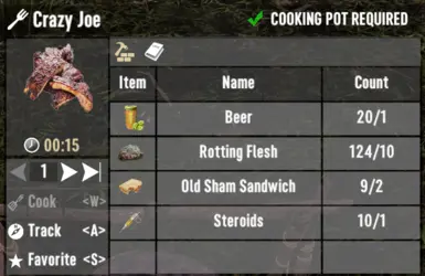 《七日杀》疯狂的乔MOD,简单的食物模组允许您制作新的食物“Crazy Joe”,它授予您临时的上帝模组。 但是你仍然可能受伤、感染、流血等。增益持续时间 10 秒,且无法叠加。用烹饪锅在篝火上制作。恢复 15 份食物和 5 点生命值 去除 10 点水。