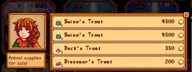 《星露谷物语》香草动物的零食MOD,Marnie 每天将出售 3 个零食,您有机会为您的宠物购买一个零食。恐龙零食和野生浆果零食(用于鸵鸟)只有在您已经出售过它们的蛋一次的情况下才能购买(尽管不会每天出现)。