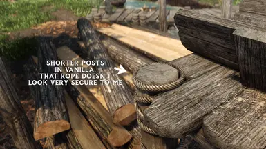 《上古卷轴5:天际重制版》农舍人行道的更高柱子MOD。这是一个简单的mod,加长了柱子,以便绳索进一步缠绕。这更符合它们在码头和其他人行道(农舍二楼、岗哨)上的包裹方式。柱子的高度也各不相同,以提供更逼真的手工建造感觉。