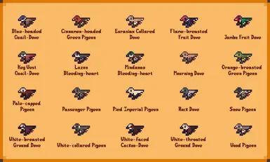 《星露谷物语》鸽子饰品伴侣MOD,一个简单的mod,这个模组把你的鹦鹉小饰品伙伴变成一只可爱的小鸽子,有 20 种不同的物种可供选择!