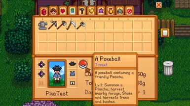 《星露谷物语》皮卡丘同伴饰品MOD,一个简单的mod,这个模组添加了一个新的 Pokeball 小饰品,可以召唤一个有用的皮卡丘伙伴。