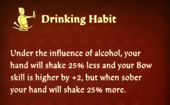 《天国:拯救2》饮酒习惯福利MOD,在酒精的影响下,你的手会减少 25% 的颤抖,你的弓技能会高出 +2,但当清醒时,你的手会多颤动 25%。