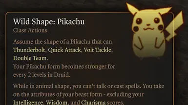 《博德之门3》皮卡丘野兽形态MOD,这个 mod 为德鲁伊添加了一个新的 Wild Shape 选项:变身为皮卡丘的能力。