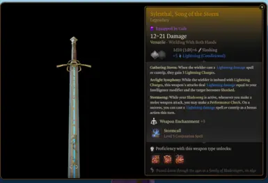 《博德之门3》风暴之歌MOD,加上 Sylrathal, Song of the Storm — Bladesingers 的传奇长剑。可在教程箱中找到。只有原生闪电法术会产生充能。未来更新:平衡位置、自定义模型和匹配的盔甲套装。