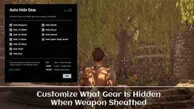 1、在游戏中完全可定制。收起时自动隐藏您的武器、盾牌、箭袋、头盔或盔甲 - 以获得更清晰、更身临其境的视觉效果。