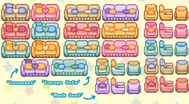 《星露谷物语》可爱的家具外观MOD,这款 2 人座沙发将“双人沙发”提升到了一个新的水平,带有心形枕头!非常适合您和您的配偶拥抱“休闲沙发”有 4 个柔软的枕头。而且两张沙发的底部都有可爱的荷叶边细节!“角落座椅”将成为您的农民新的理想阅读椅!