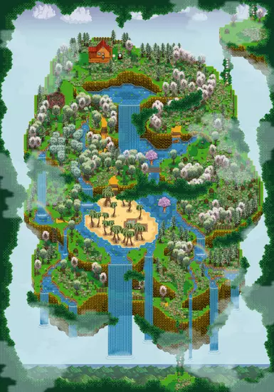 《星露谷物语》夸尔的浮动农场MOD,为你的游戏添加了浮空岛屿,默认替换森林农场;可开关彩虹和花朵装饰。让你在星露谷获得更好的物品外观!