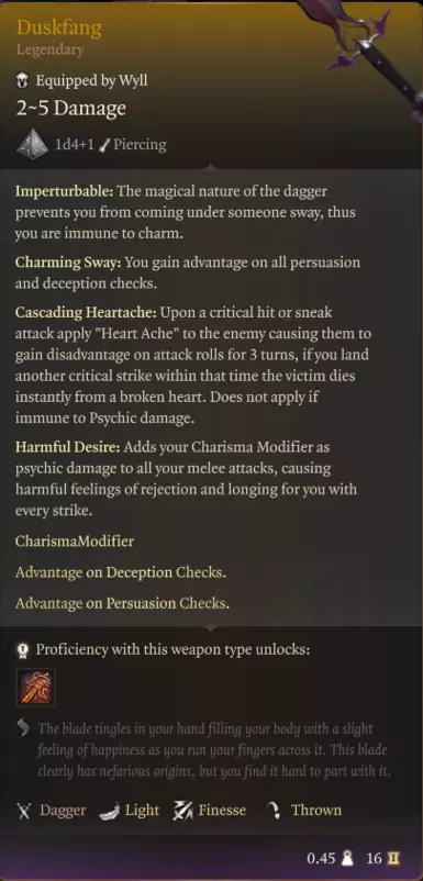 《博德之门3》魅魔主题匕首MOD,这个模组是一把以魅魔为主题的匕首,它以精神伤害的形式将拒绝阶段施加在受害者身上。该武器在战斗中并且仅在战斗中具有特殊但不过分夸张的 vfx。我这样做只是为了增加一点细节。感兴趣的小伙伴快来3DM下载吧!