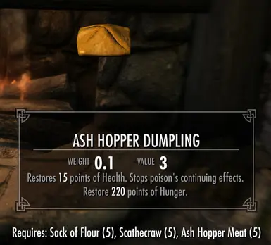 《上古卷轴5:天际重制版》可煮灰斗肉和腿MOD,添加了两个新物品,煮熟的灰斗腿和灰斗饺子,它们可以分别用灰斗腿和灰斗肉制作。感兴趣的小伙伴快来3DM下载吧!