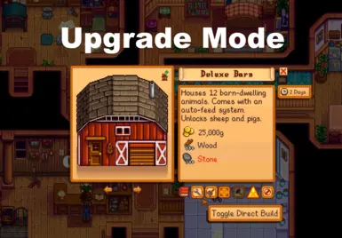 1、有资源直接建造豪华鸡舍/谷仓/其他升级,但又不想连续 3 次回到罗宾身边?这个模组允许你告诉罗宾跳过升级过程,直接从头开始构建它们,并支付适当的成本和天数!