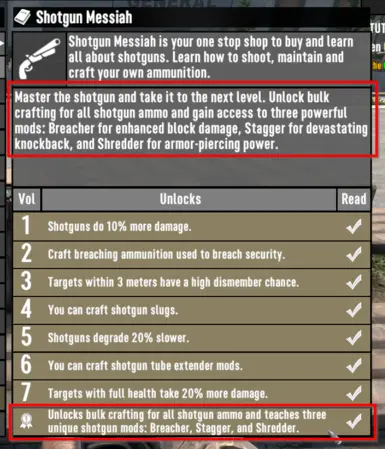 《七日杀》霰弹枪专家MOD,完成霰弹枪弥赛亚可解锁三个新的可制作模组——Breacher(额外格挡伤害)、Stagger(击退)和 Shredder(盔甲粉碎)“一击最多木块”的特权被 Breacher mod 取代,因此您可以根据需要将其关闭。感兴趣的小伙伴快来3DM下载吧!