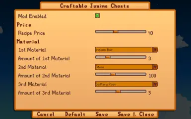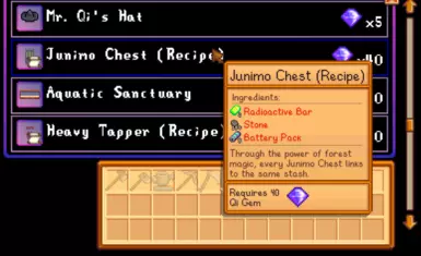 《星露谷物语》可制作的朱尼莫宝箱MOD,有没有想过制作自己的朱尼莫宝箱!如果是这样的话,那么这个模组适合你。该配方可以从 Qi 先生处购买,价格为 40 个 Qi 宝石(可配置),默认成本为 2 个放射性锭、150 个石头和 5 个电池组。每个数量都可以更改。此外,放射性锭可以更改为铱锭,石头可以更改为木头,电池组可以更改为棱柱形碎片。感兴趣的小伙伴快来3DM下载吧!
