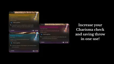 《博德之门3》优雅香水MOD,基础版本(优雅香水)将给你+1 魅力豁免检定和能力检定的加成。更优雅的香水(+2 加成)和至尊优雅(+3 加成)也是如此。单击使用它,它将应用“优雅”条件,持续到长时间休息。它不会在您使用后自行消耗,因此您可以继续使用直到时间结束。感兴趣的小伙伴快来3DM下载吧!