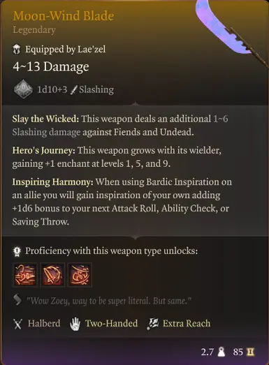 《博德之门3》月风之刃MOD,将 Mira 的 Gok-Do 添加到 BG3 中,这是一把以吟游诗人为主题的武器,原因非常明显。感兴趣的小伙伴快来3DM下载吧!