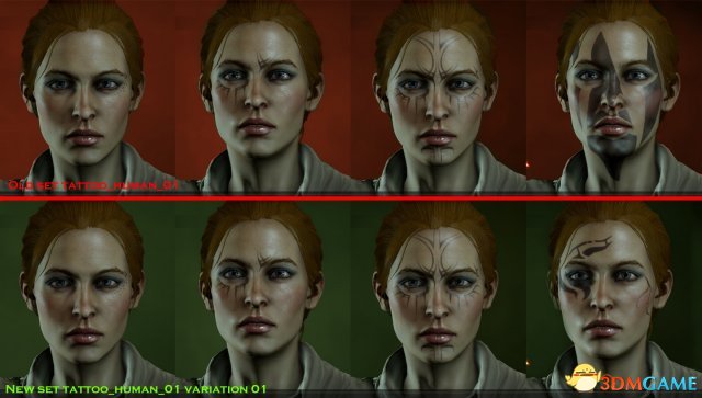 龙腾世纪3:审判 前代优秀脸纹替换MOD;选择了前几代优秀的脸纹将龙腾世纪3中的部分冷门脸纹加以替换,喜欢的玩家不妨一试。