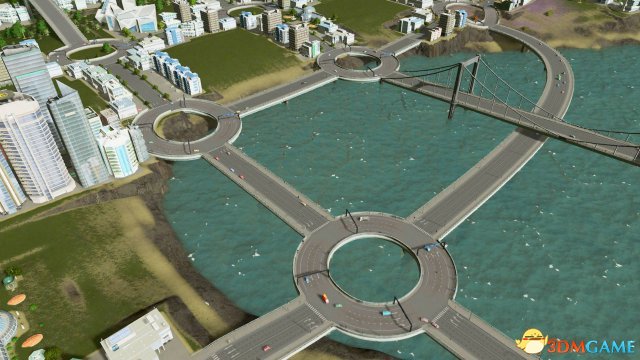 所有的交叉点都用圆形环岛解决,环岛采用单行线高速公路,连线采用普通双线车道,这样的话,整个城市都没有红绿灯,完美分流所有车辆,就算全城没有公共交通设施,也没有任何问题。