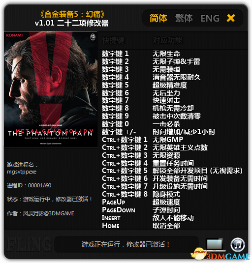 《合金装备5:幻痛》修改器大全!为广大遭受痛苦的玩家提供全面强大的多功能修改器,包含3DM风灵月影,GOG等多种修改器,致力于给玩家一个良好的游戏环境,最佳的游戏体验。欢迎前来3DM《合金装备5:幻痛》修改器大全下载!