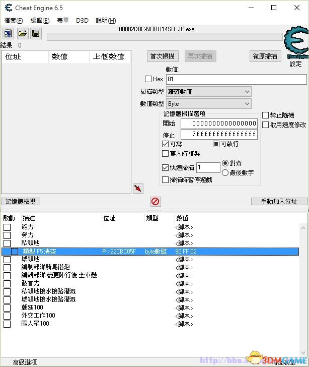 信长之野望创造:战国立志传 中文多项CE修改脚本;由3DM论坛会员 hsd602 分享,包含多项修改功能,喜欢的玩家有爱自取。