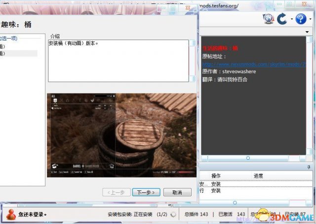 上古卷轴5:天际 身临其境的木桶;由3DM论坛会员 请叫我铃百合 制作分享,生活的趣味:一些杂七杂八的(目前是木桶),可以简单理解为这是美化,和其他一些著名的mod(比如动态物品-Dynamic Things)有兼容补丁,均已集成在安装包中并均已汉化,其它的详见安装界面吧。