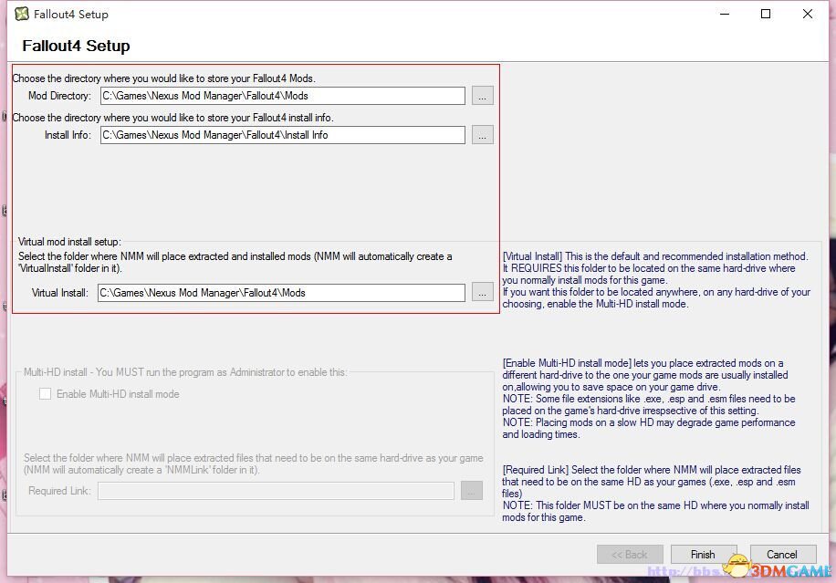 这里选择辐射4MOD包的存储位置及缓存位置,一般不需要设置直接默认就可以了,点击确定即可进入主界面