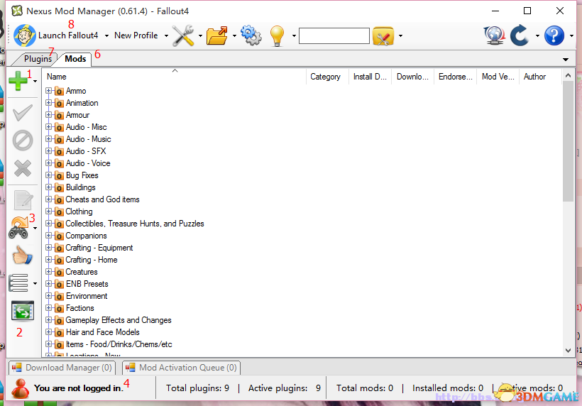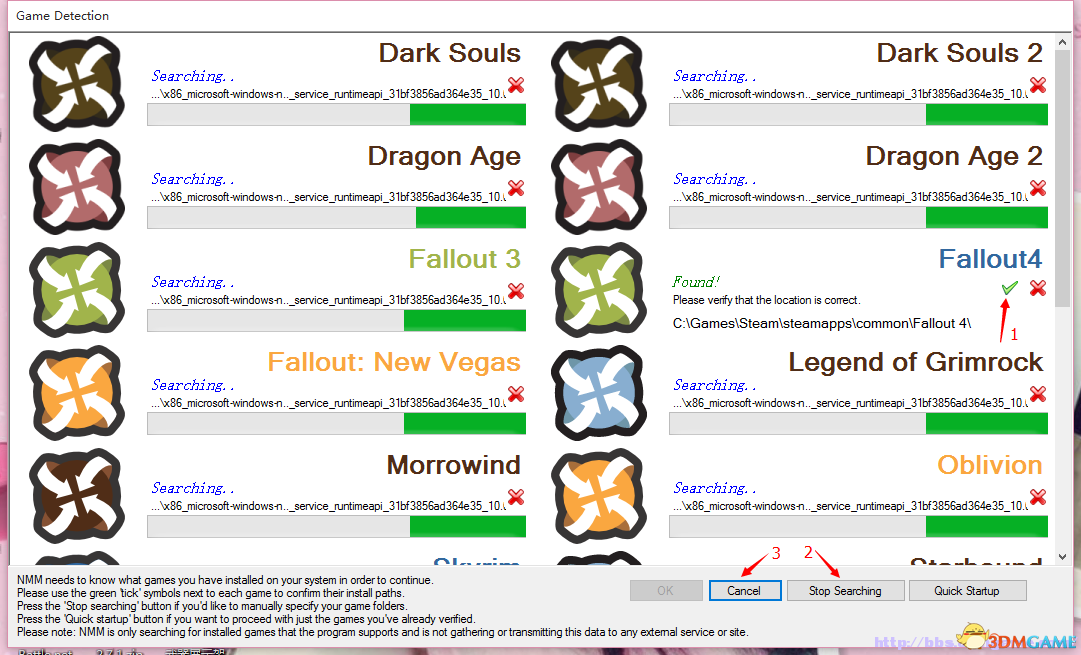 从图中可以看到NMM在自动搜索支持的游戏,并且已经搜索到辐射4,当然没搜索到也不要急可以自己添加,搜索到后点击辐射4下方的 绿色对勾,然后点击第二个箭头的指向来取消扫描,然后点击OK,NMM会跳转到以下页面(如果只选择了一个游戏就没有以下画面)
