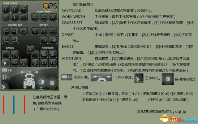 4.左ctrl+小键盘3识别工具工作宽度(先展开到最大),有时候识别不对就多按两下,下面信息面板的拖拉机头上会显示识别的宽度 右上角有一组[+ - A]按钮 A就是自动识别,+-微调;