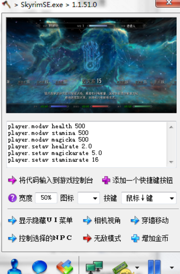 下面的两排按钮可以右键删除,自己自定义自己的快捷键于按钮. 控制台命令可以在论坛搜索一下, 物品等代码可以用 ECM 找一下。