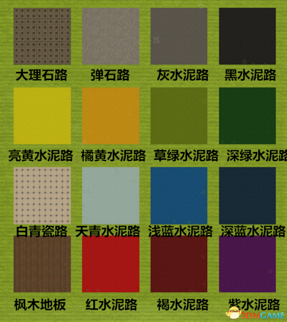②地板:大理石路、弹石路、灰水泥路、黑水泥路、 亮黄水泥路、橘黄水泥路、草绿水泥路、深绿水泥路、 白青瓷路、天青水泥路、浅蓝水泥路、深蓝水泥路、 枫木地板、红水泥路、褐水泥路、紫水泥路。