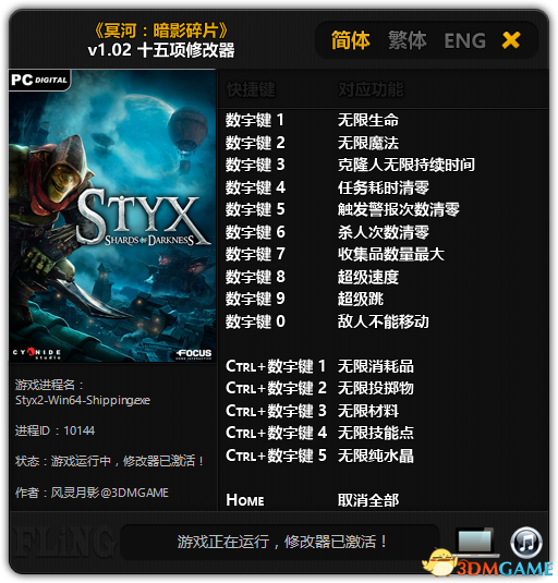 3. “无限技能点”和“无限纯水晶”如果在某个菜单界面中激活,可能要关一下菜单才会生效。
