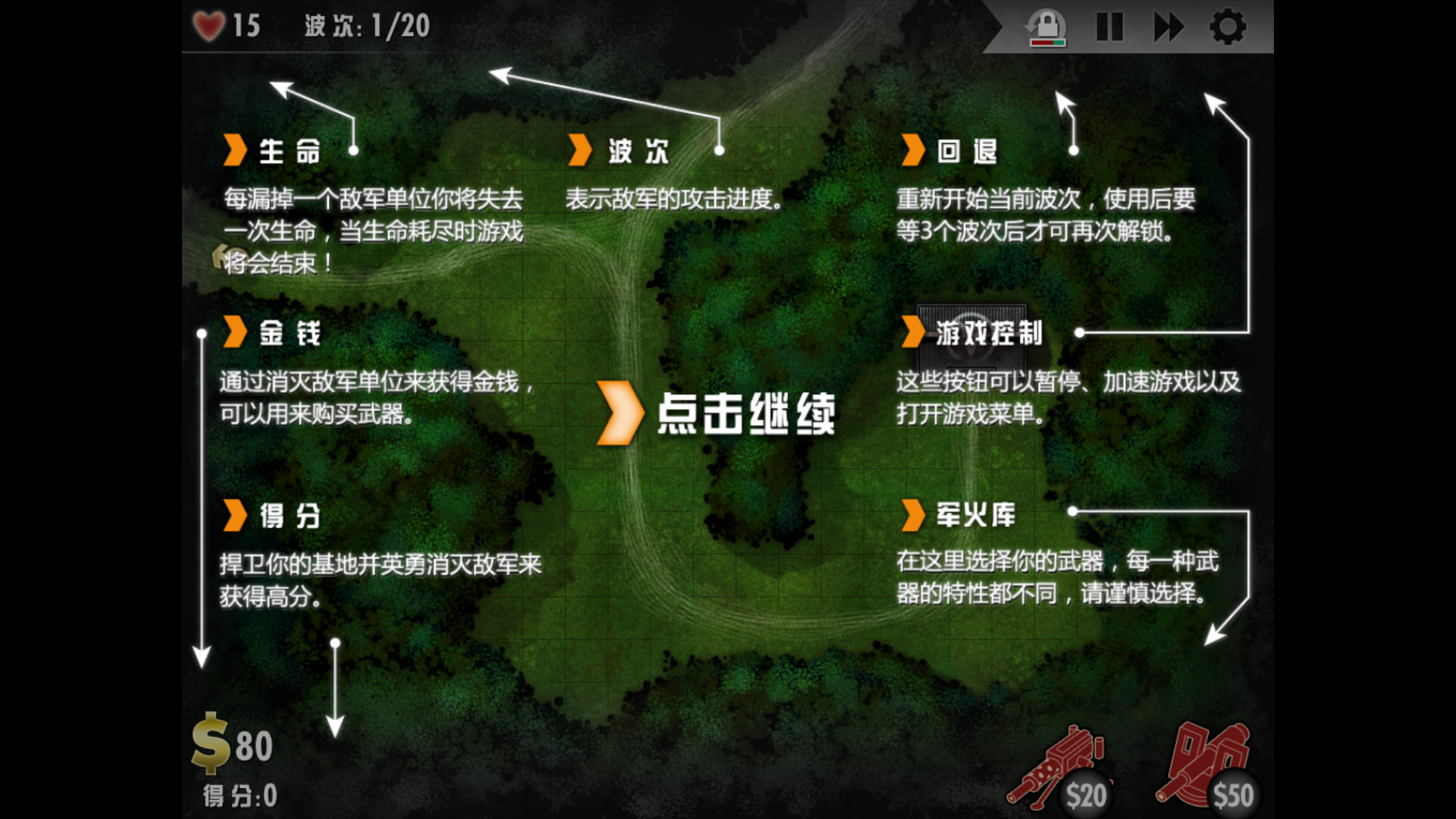《轰炸机防御战》玩法和传统塔防类似,而且操作非常直观,你可以利用资源来修建防御工事抵御敌方进攻,不同的防御有不同的能力,资源也可以通过击毁敌方部队而不断获得。