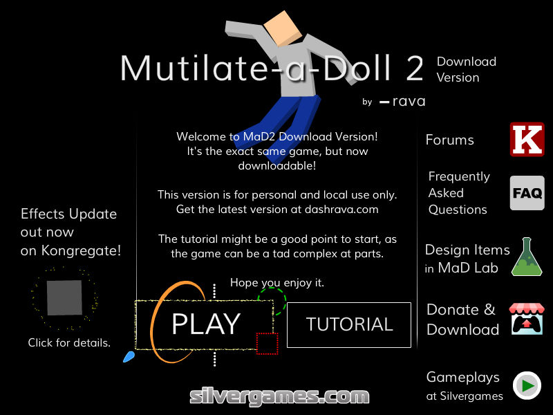 1人《测试假人2(Mutilate-a-Doll 2)》是由-rava制作的一款模拟经营类游戏,游戏中玩家要设定属于自己的实验室,通过建造以及摧毁来完成,游戏中可调整的东西很多,像是调整娃娃的形状、大小、数量甚至是重力也能改变。