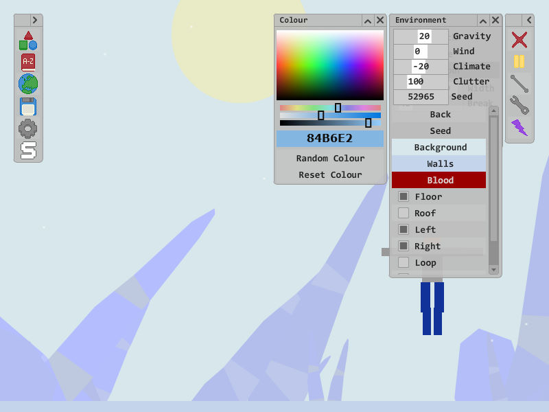 戏中玩家要设定属于自己的实验室,通过建造以及摧毁来完成,游戏中可调整的东西很多,像是调整娃娃的形状、大小、数量甚至是重力也能改变。